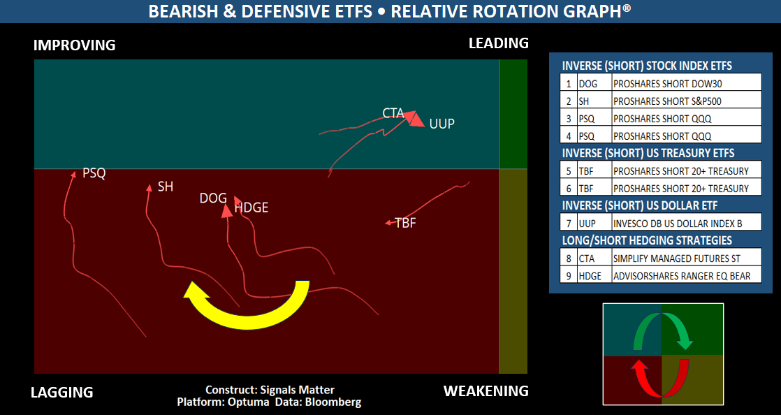 Enter the bearish and defensive ETFs — tactical tools designed to profit from market declines or hedge against rising economic risks. Many of these hedges, particularly short-side ETFs, have been steadily rotating from the Weakening quadrant into Lagging territory, now showing early signs of potential improvement as equities begin to soften. This shift suggests that downside protection is gaining traction, with capital gradually rotating toward contrarian plays and volatility buffers.